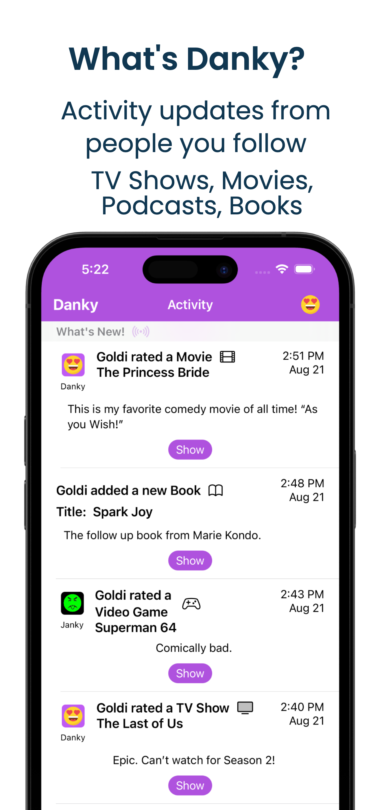Movies, TV Shows, Podcasts, Video Games, and Books